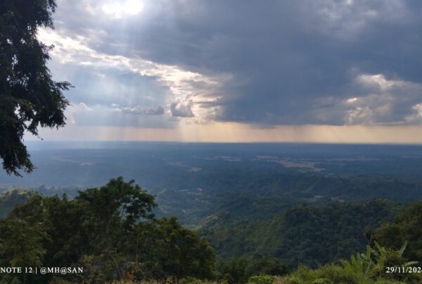 এরপর বেশ খাড়া পথ। ২৪০ মিটার উপরে পাহাড়ের গায়ে একটা বিশাল শিমুল গাছ যেন আকাশে পাখা মেলে আছে। পাহাড়ের খাঁজে এক জুম ক্ষেতের পাশে এসে দাঁড়ালাম। সামনে বিস্তৃত পাহাড়ের মেলায় মেঘের খণ্ড খণ্ড ছায়া! একপাশে রাঙামাটির সবচেয়ে বড় পাহাড় ফুরমোনকে ধ্যানমগ্ন দেখা যায় অন্য পাশে সীতাকুণ্ড রেঞ্জের পাহাড়গুলো। যতদুর চোখ যায় নীল পাহাড়ের ঢেউ, উপরে সাদা-ধূসর চঞ্চলা-বিক্ষিপ্ত মেঘ। তার ফাঁক গলে সূর্যালোকের দৃষ্টি গোচর হয়ে পাহাড়ে নেমে আসা অবাক চোখে বহুক্ষণ দেখলাম। যেন স্বর্গীয় কোন আলো। প্রতিটি বিচ্ছুরণ নীল সবুজ ক্যানভাসে আলাদা করে চোখে ধরা পড়ছে।